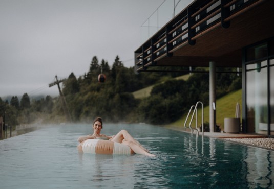Wohlfühlen in unserem 1.500m² großen Wellnessbereich „Nature’s Nest“ mit Saunen, Goldstollen, Schaumdampfbad und Kaltwasserbecken, 22m Infinity Pool mit Sky Walk, Whirlpool uvm.